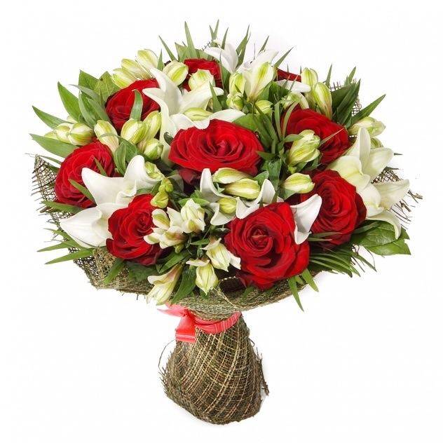 Основу неповторимого букета «Душа» составляют изящные алые розы, нежные лилии и белоснежные альстромерии. Завершающим элементом данной композиции являются плотные изумрудные листья салала.